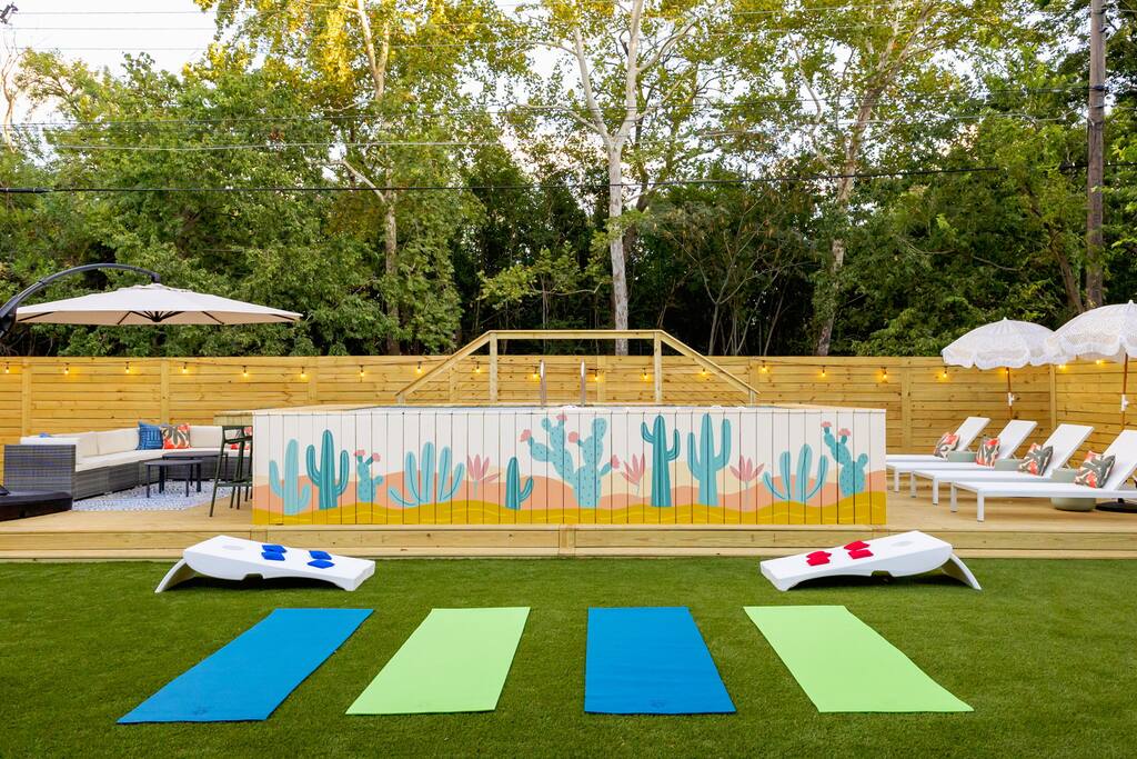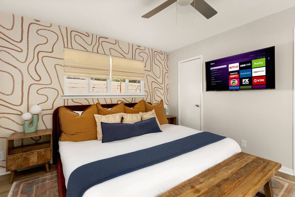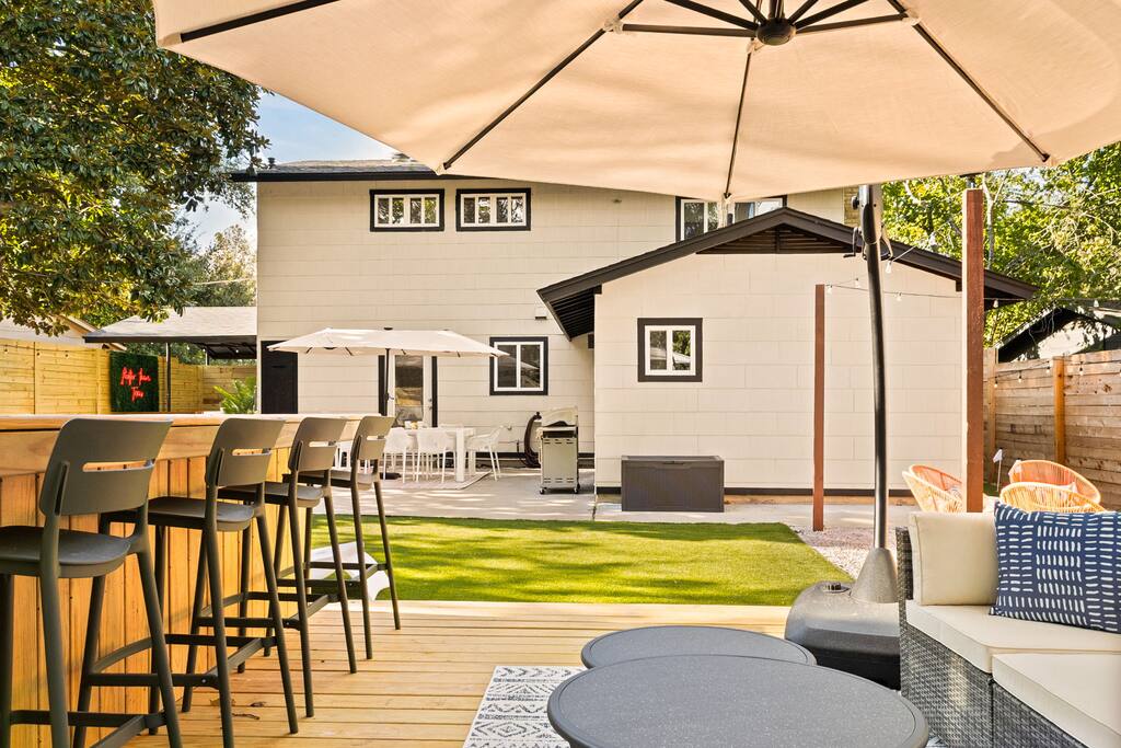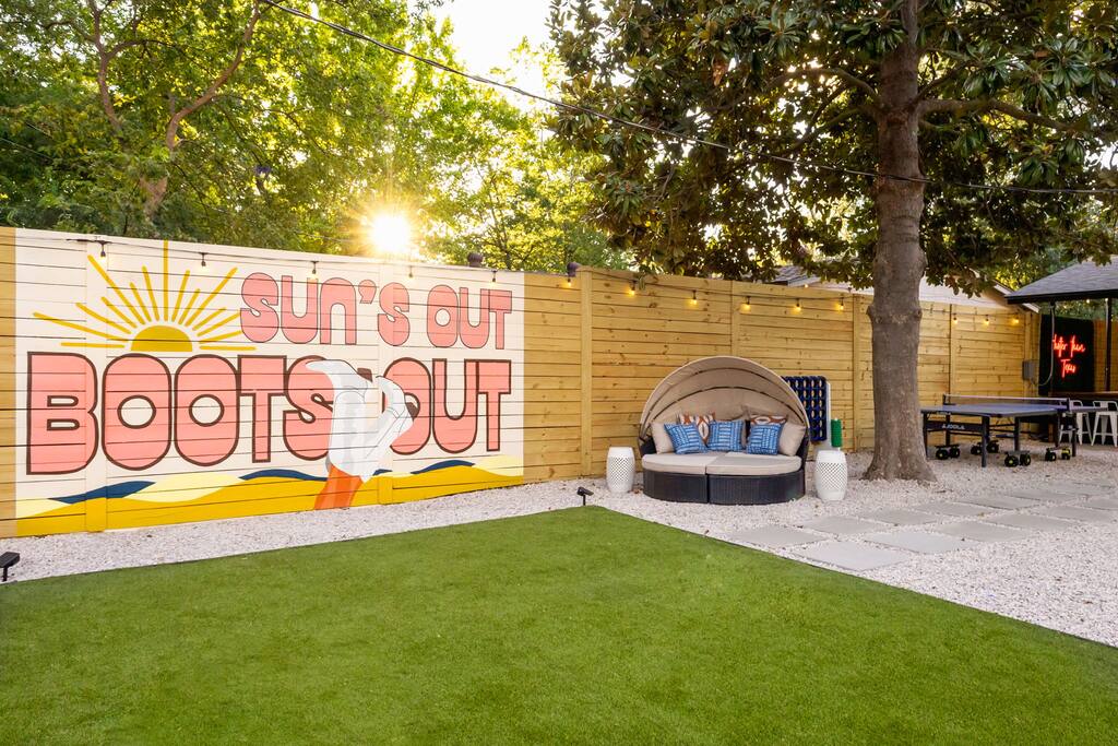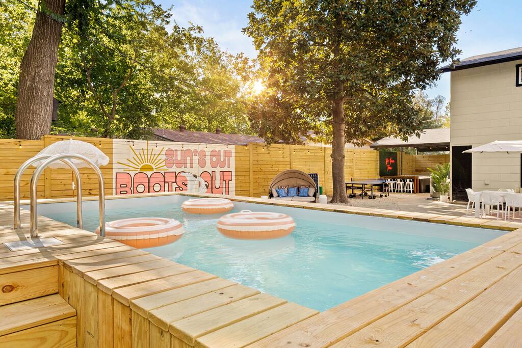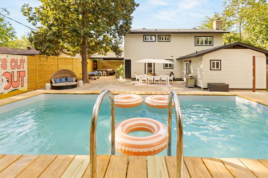 Centrally located just south of SoCo & downtown, our 4 bed / 3 bath retreat comfortably sleeps 14 and is packed with thoughtful amenities for an unforgettable Austin experience! LUXURY RESORT-STYLE BACKYARD: ☀ Heated pool for year-round swims ☀ Covered hot tub lounge with outdoor TV ☀ Cozy string-lit fire pit ☀ Mini golf green for some friendly competition! ☀ Full-size ping pong table ☀ Large outdoor dining table + grill ☀ Plenty of outdoor seating ☀ Yoga mats & yard games! PRIVATE MOVIE THEATER ROOM: ☀ 100-inch screen with 4k projector ☀ Immersive surround sound system ☀ Popcorn machine for true movie night vibes ☀ Get-ready station with large light-up mirrors! ☀ Retro arcade games ☀ Oversized sectional sofa with pull-out queen sleeper FIRST FLOOR COMFORTS: ☀ Open concept living & dining ☀ Fully stocked kitchen w/ stainless steel appliances ☀ Premium coffee station for your morning kick! ☀ King bedroom w/ ensuite bathroom + workspace ☀ Laundry room with washer & dryer SECOND FLOOR DREAMING: ☀ Double queen bedroom w/ ensuite bath + glam station! ☀ Second king bedroom ☀ Additional double queen bedroom ☀ Full hallway bathroom CLOSE TO EVERYTHING: » Downtown Austin → 10 min » South Congress (SoCo) → 6 min » Zilker Park (ACL) → 14 min » Rainey Street → 12 min » State Capitol → 16 min » UT Football → 18 min » Austin Convention Center → 17 min » The Domain → 25 min » Lake Travis → 35 min » Austin-Bergstrom Airport → 11 min Whether you’re lounging poolside, toasting under string lights, or getting ready for a night on the town, Sunset Social is where your Austin memories shine brightest. Designed with group getaways in mind, this home mixes resort-style fun with cozy cowboy touches—the perfect backdrop for a weekend with your favorite people in ATX.